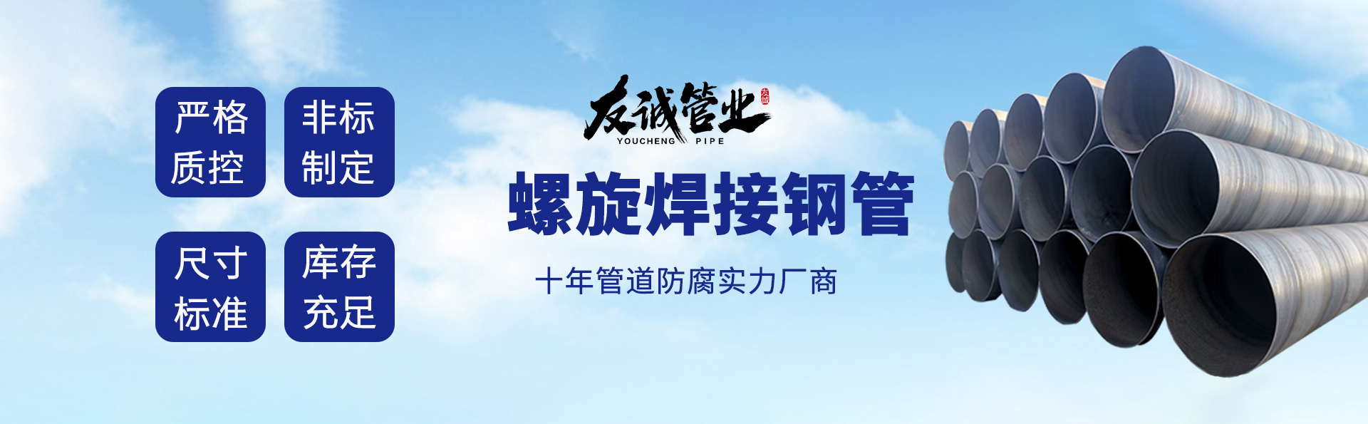 滄州友誠(chéng)管業(yè)有限公司是一家專(zhuān)業(yè)從事生產(chǎn)防腐涂塑管道及管件于一體的大型企業(yè)。公司注冊(cè)資金8600萬(wàn)元,位于中國(guó)管道生產(chǎn)基地—河北鹽山縣,近靠京滬高速、榮烏高速、黃石高速30公里,高鐵滄州西站40公里,天津國(guó)際機(jī)場(chǎng)、濟(jì)南遙墻機(jī)場(chǎng)150公里,為客戶(hù)來(lái)訪(fǎng)及業(yè)務(wù)發(fā)展提供了便利的交通條件。        鋼管系列:螺旋鋼管、無(wú)縫鋼管、ERW直縫焊管、JCOE埋弧焊直縫鋼管、熱鍍鋅鋼管。        涂塑系列:內(nèi)外涂塑鋼管、涂塑復(fù)合鋼…… 了解更多